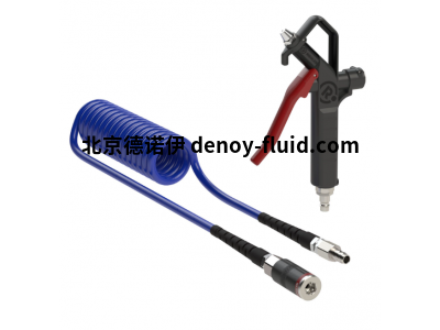 即時(shí)操作軟管套件,包括聚氨酯螺旋軟管、計(jì)量吹氣槍、永久連接的內(nèi)徑 7.4 按鈕安全接頭和鍍鋅鋼塞接頭。
